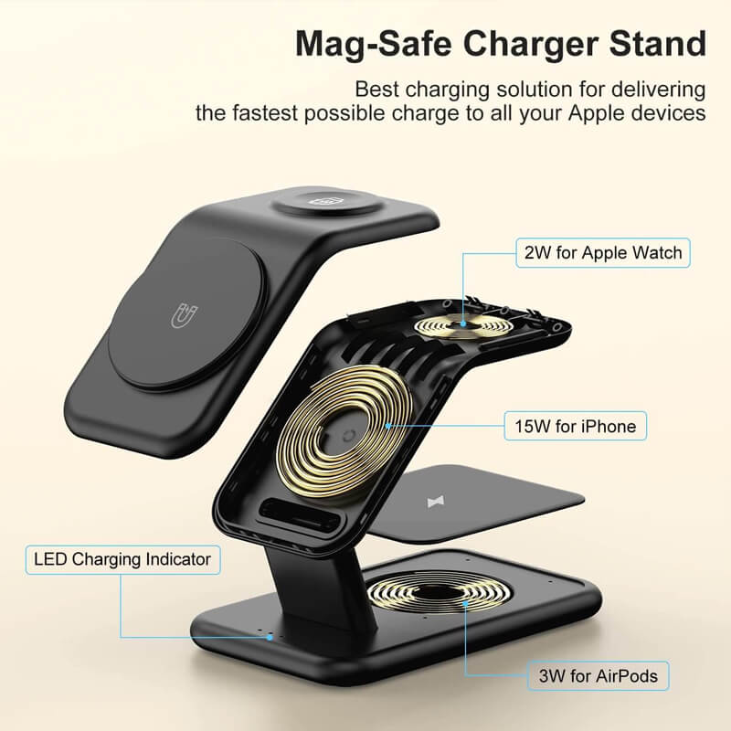 – The 3 in 1 Magsafe Charger Stand also features a third wireless module designed for your AirPods or AirPods Pro, so you can now charge all three devices from a single AC outlet.