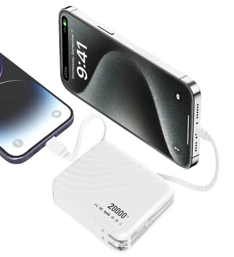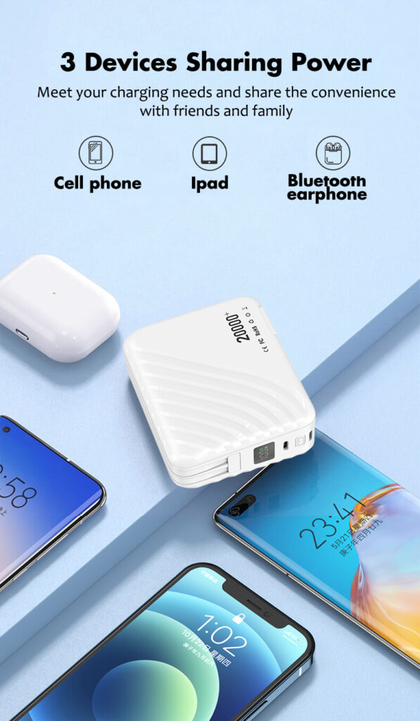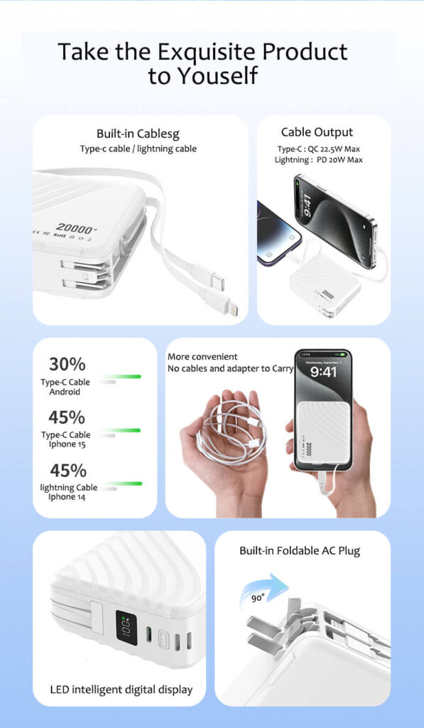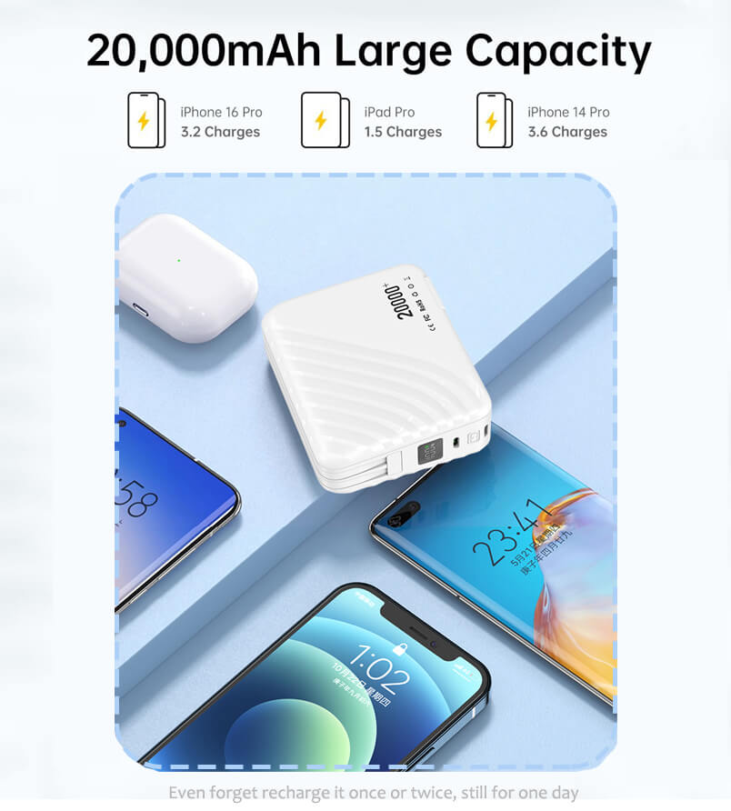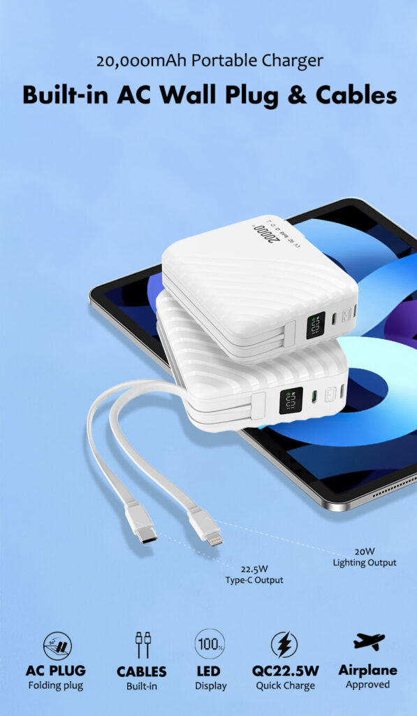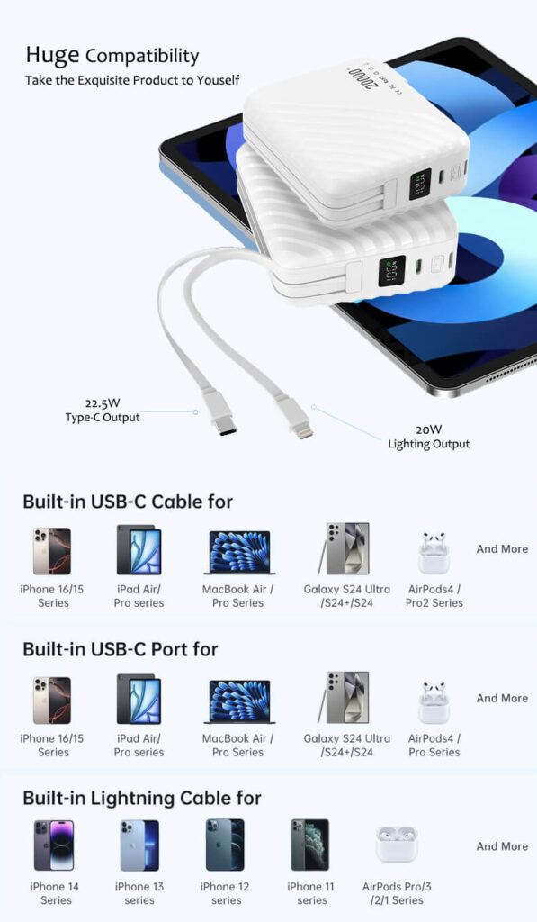 4-in-1: Adapter, Built in cables(USB-C&Lightning), LED Display, and 20,000mAh Power bank. For iPhone 16/15/14/13/12/11 Pro/Max series, Samsung, Google Pixel, Android phone, iPad, AirPods, MacBook Air, tablet, laptop, drone, MP3 player, speaker, camera…etc.
