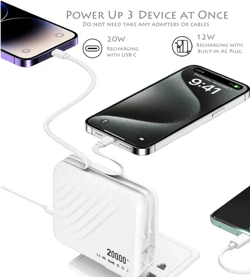[AC Wall Plug Power Bank] :This versatile portable charger features a built-in AC wall plug, providing seamless charging for iPhone, Android, and USB-C devices. Recharge directly from any wall outlet—no cables required. Perfect for travelers, this compact charger eliminates the need for multiple charging cords, making it an essential accessory for keeping your devices powered on the go.